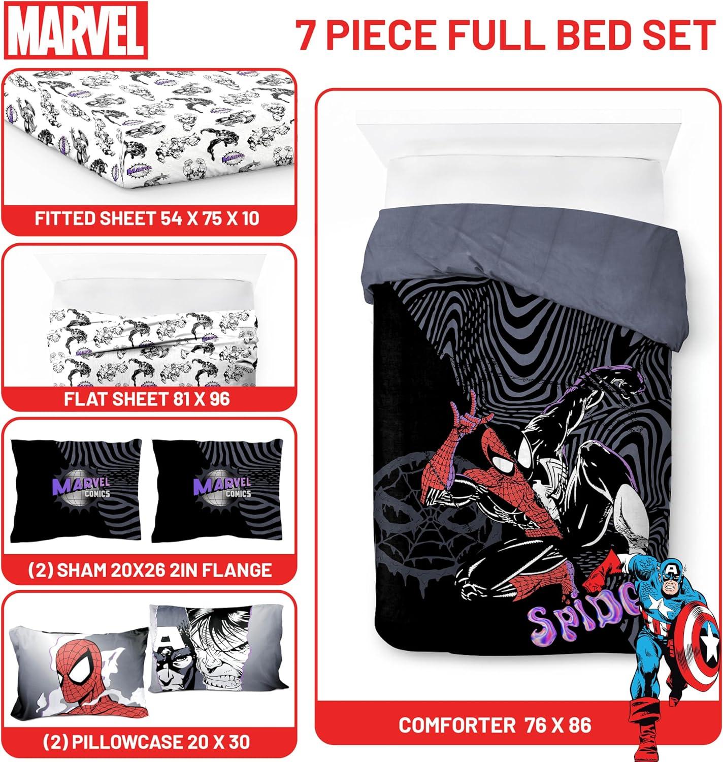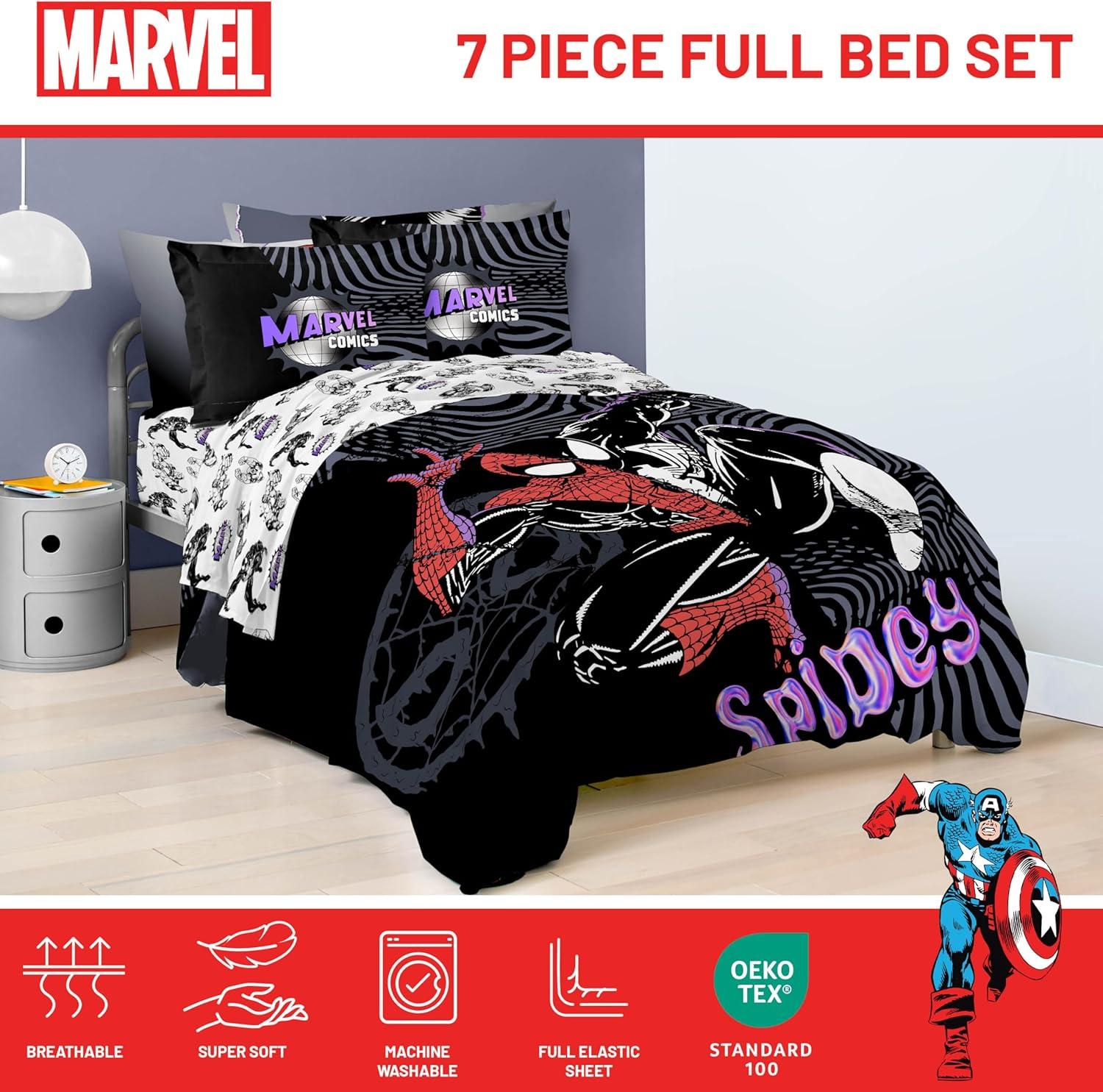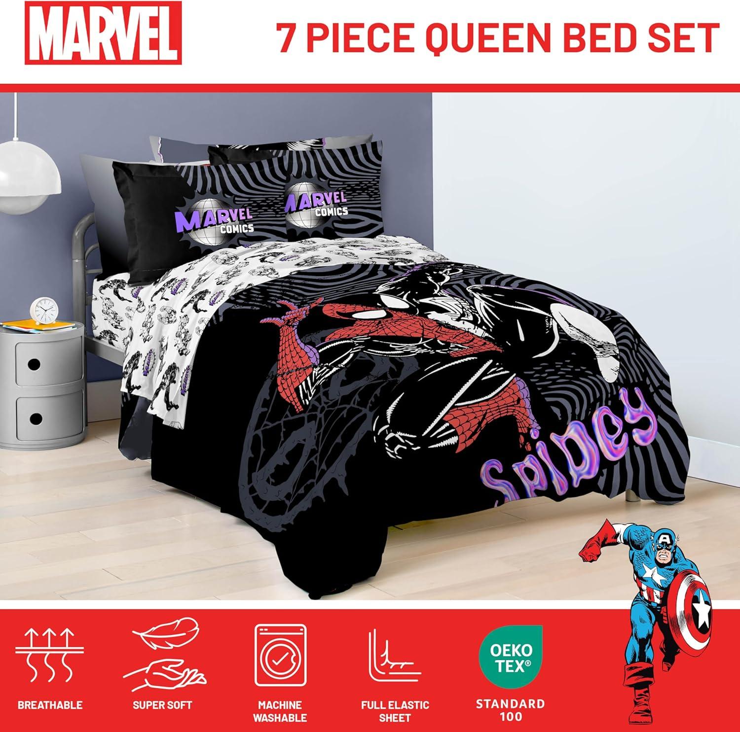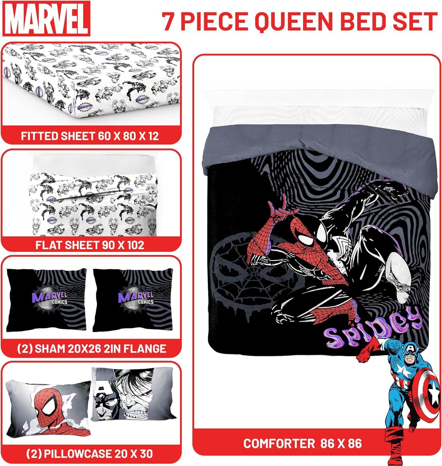 Transform your child's bedroom with our exciting 7-Piece Queen Bedding Set! This complete kids' bedding collection brings your favorite Spiderman, Hulk and Captain America characters to life, turning bedtime into an adventure. Our set includes a cozy comforter (86″ x 86″), a fitted sheet with 12″ deep pockets (60″ x 80″ x 12″), a flat sheet (90″ x 102″), two decorative pillow shams (20″ x 26″), and two standard pillowcases (20″ x 30″).Each piece is designed to create a comfortable and stylish sleep environment for your little one. Crafted from premium 100% brushed microfiber polyester, this bedding set offers the perfect blend of softness and durability. The breathable fabric ensures a restful night's sleep, helping your child wake up refreshed and ready for new adventures. Featuring vibrant designs with your favorite comic characters, this set sparks imagination and adds a playful touch to any children's room decor. Your child will love snuggling up with their favorite Marvel Avengers every night. Parents will appreciate the easy-care nature of this set. It's machine washable and long lasting, keeping the colorful designs looking great wash after wash. Simply machine wash in cold water and tumble dry on low heat. Perfect for everyday use, sleepovers, or as a thoughtful gift for birthdays and holidays. Suitable for both boys and girls, this versatile bedding set is more than just bedding – it's a ticket to dreamland adventures! Give your child the gift of magical nights and restful sleep with our Marvel Comics Queen Bedding Set. It's the ideal addition to any kid's room, combining comfort, style, and beloved characters in one fantastic package.