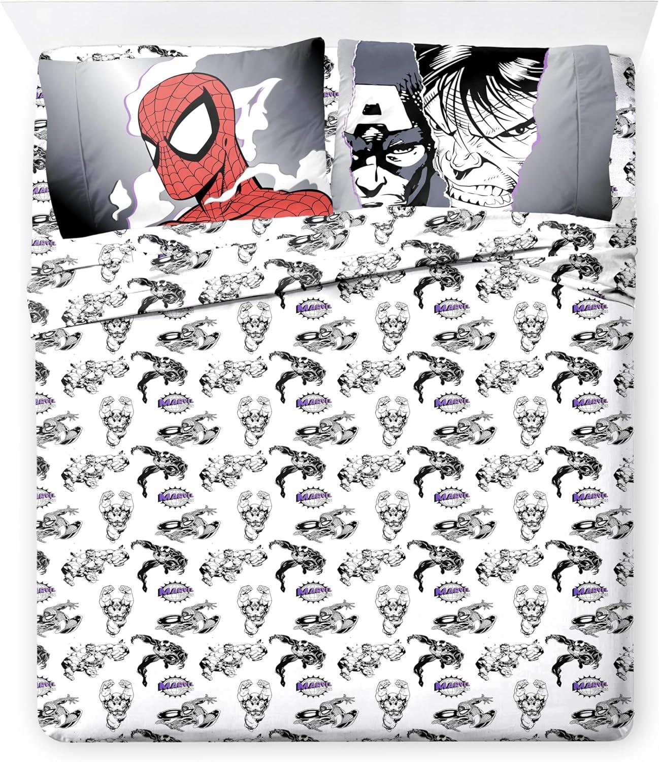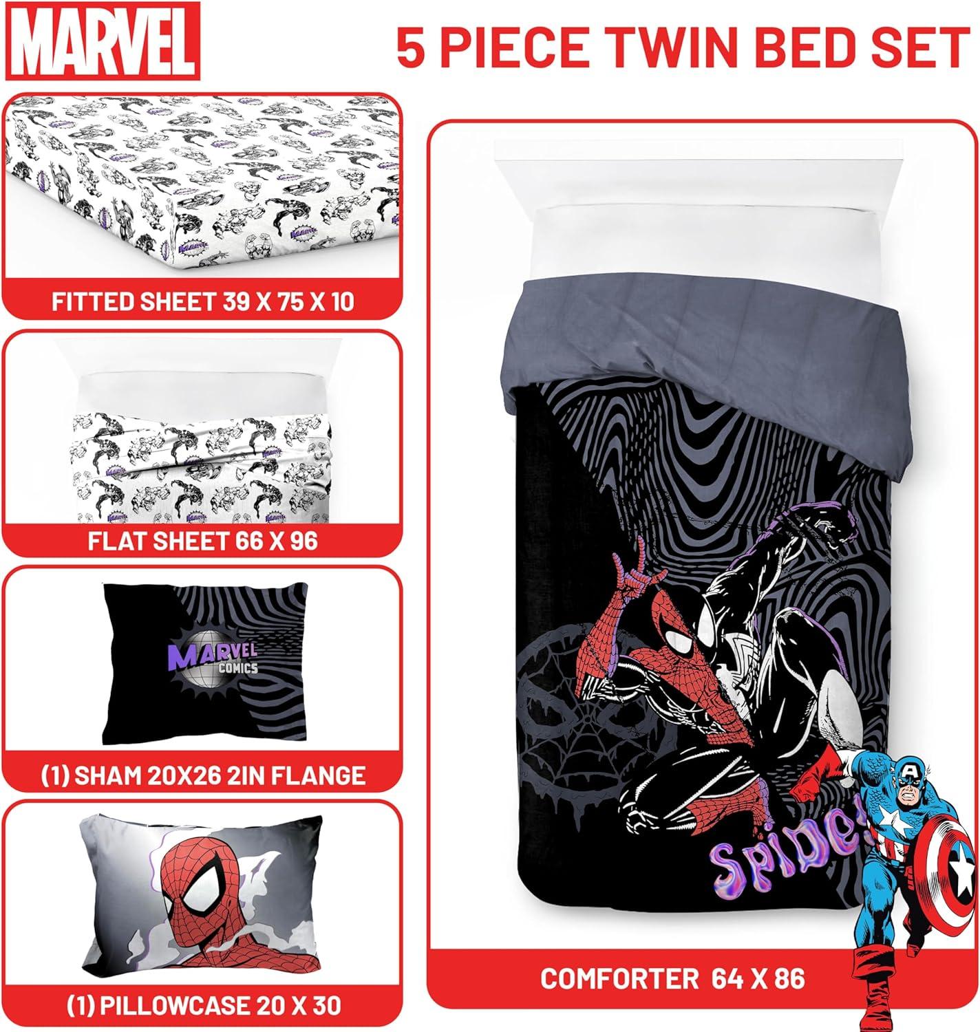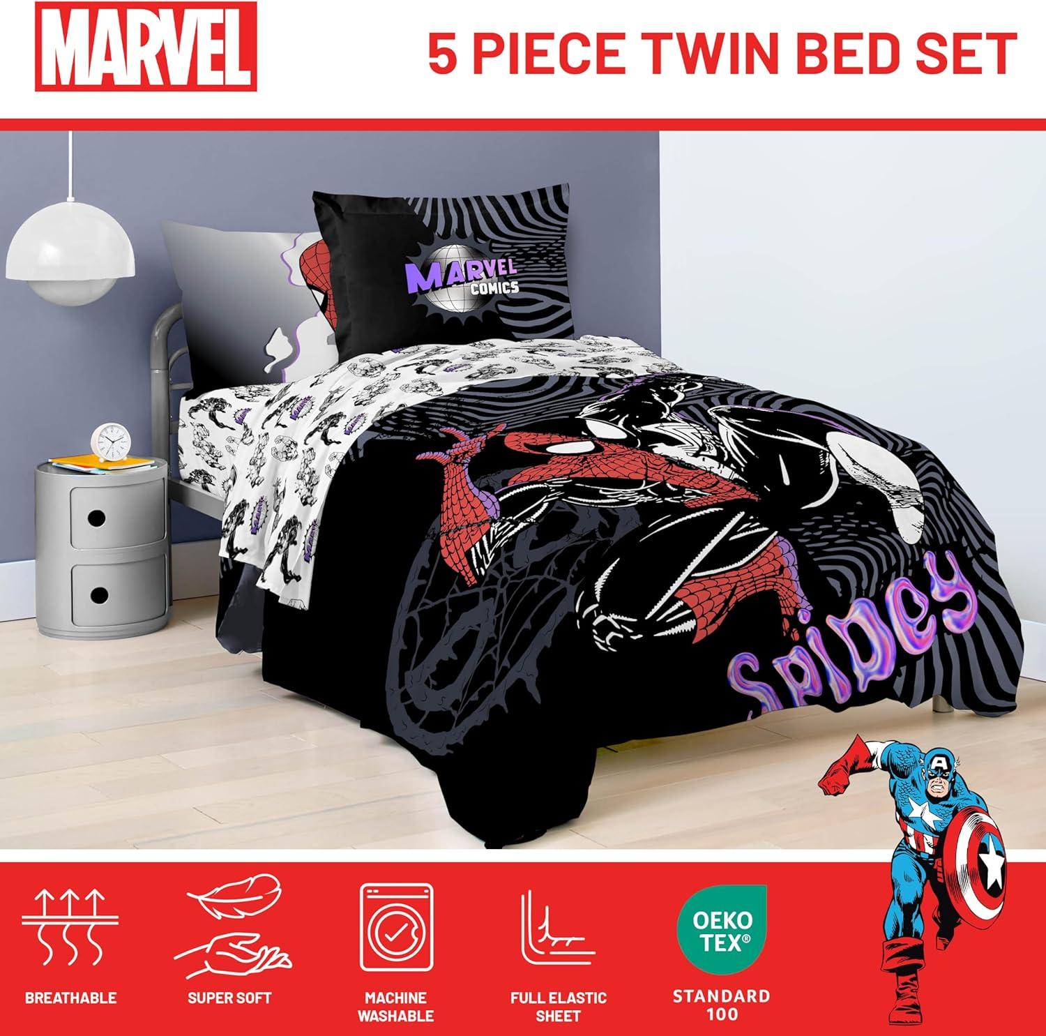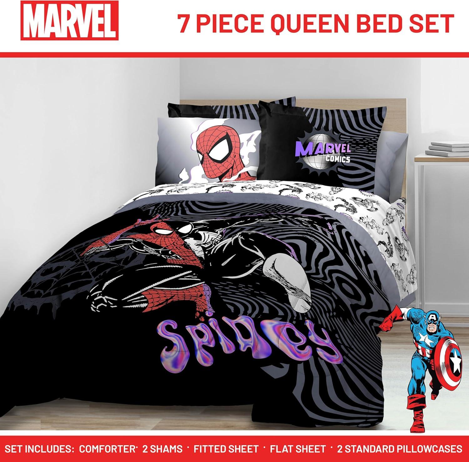 Transform your child's bedroom with our exciting 7-Piece Queen Bedding Set! This complete kids' bedding collection brings your favorite Spiderman, Hulk and Captain America characters to life, turning bedtime into an adventure. Our set includes a cozy comforter (86″ x 86″), a fitted sheet with 12″ deep pockets (60″ x 80″ x 12″), a flat sheet (90″ x 102″), two decorative pillow shams (20″ x 26″), and two standard pillowcases (20″ x 30″).Each piece is designed to create a comfortable and stylish sleep environment for your little one. Crafted from premium 100% brushed microfiber polyester, this bedding set offers the perfect blend of softness and durability. The breathable fabric ensures a restful night's sleep, helping your child wake up refreshed and ready for new adventures. Featuring vibrant designs with your favorite comic characters, this set sparks imagination and adds a playful touch to any children's room decor. Your child will love snuggling up with their favorite Marvel Avengers every night. Parents will appreciate the easy-care nature of this set. It's machine washable and long lasting, keeping the colorful designs looking great wash after wash. Simply machine wash in cold water and tumble dry on low heat. Perfect for everyday use, sleepovers, or as a thoughtful gift for birthdays and holidays. Suitable for both boys and girls, this versatile bedding set is more than just bedding – it's a ticket to dreamland adventures! Give your child the gift of magical nights and restful sleep with our Marvel Comics Queen Bedding Set. It's the ideal addition to any kid's room, combining comfort, style, and beloved characters in one fantastic package.