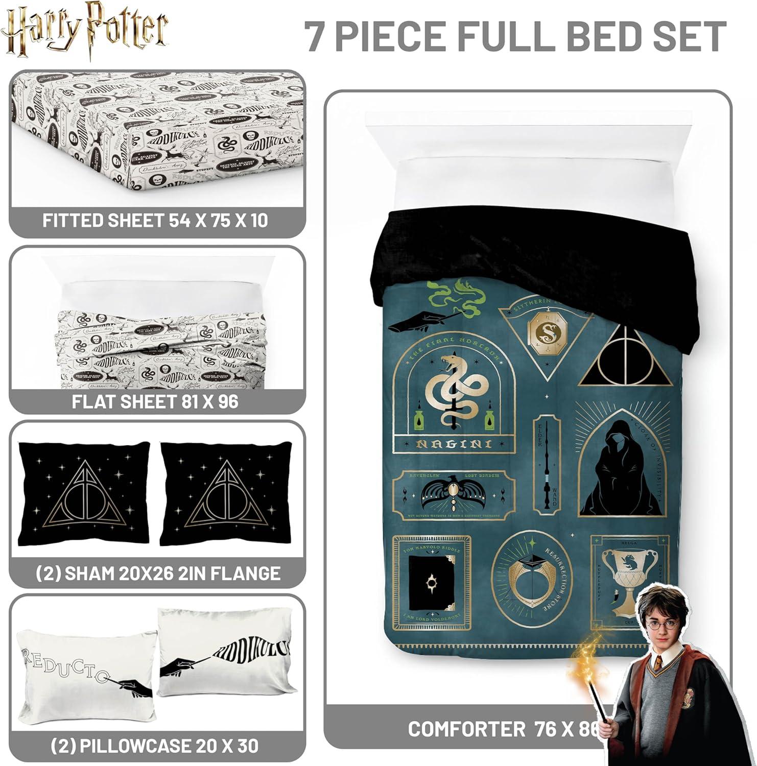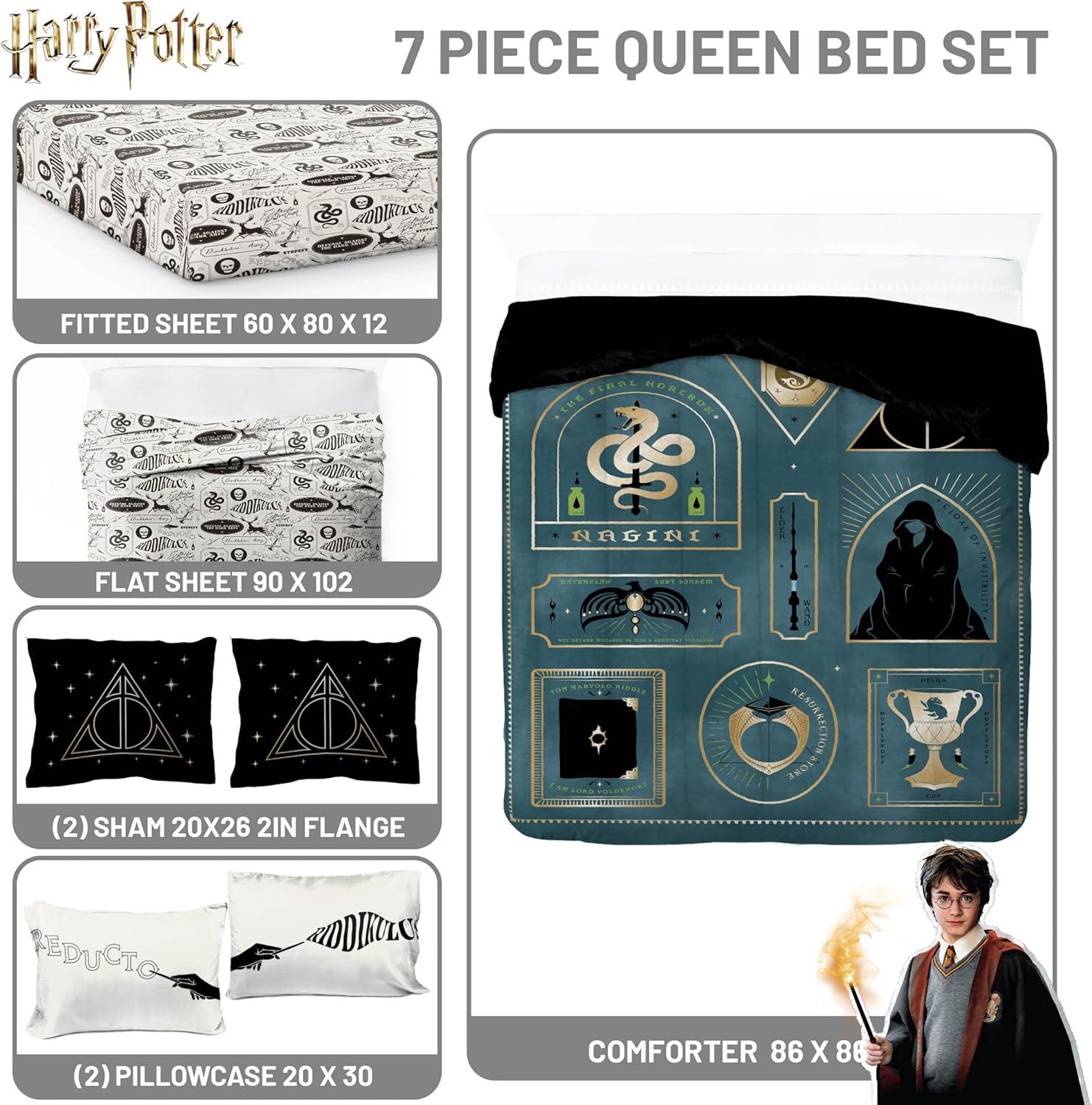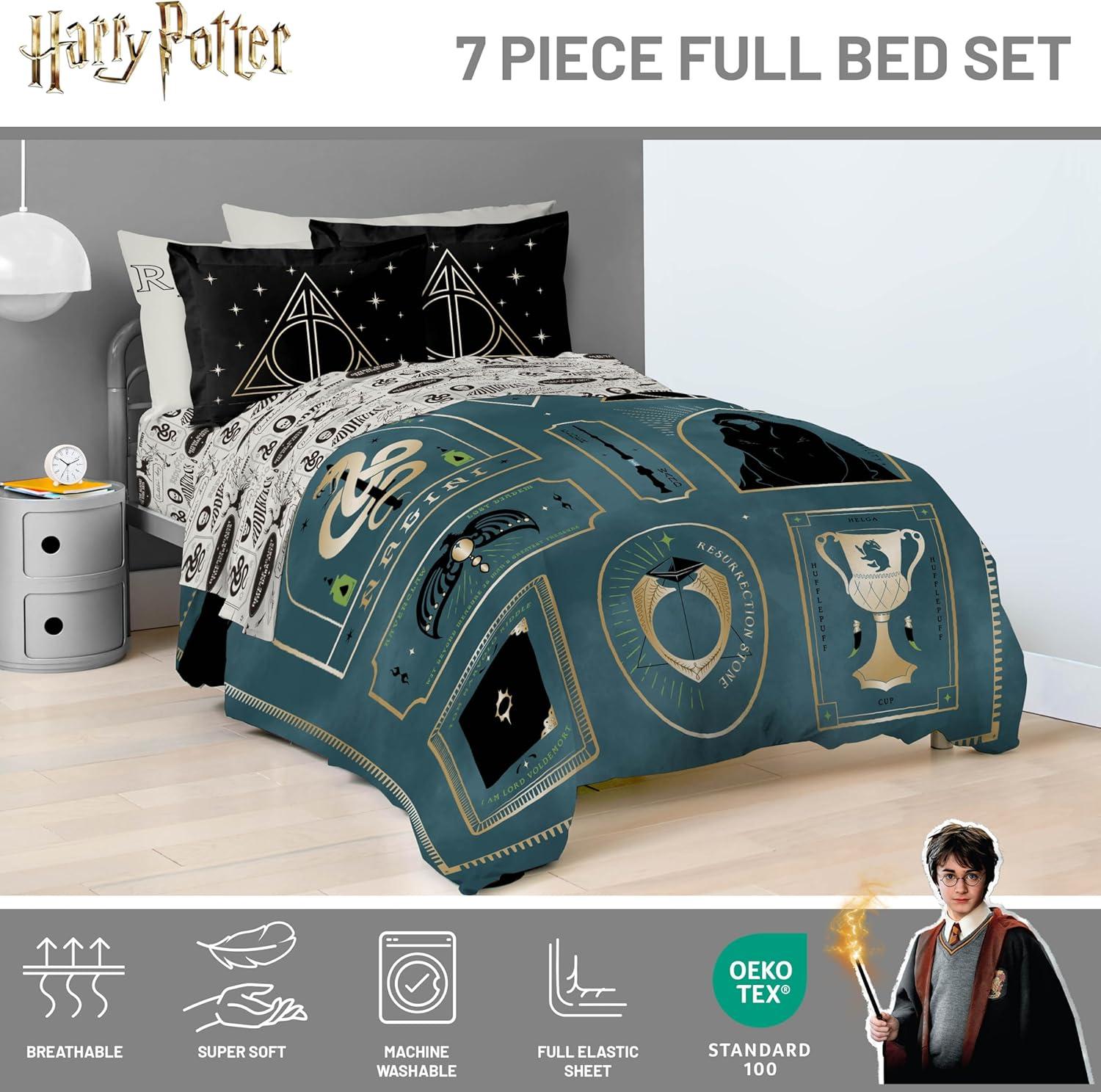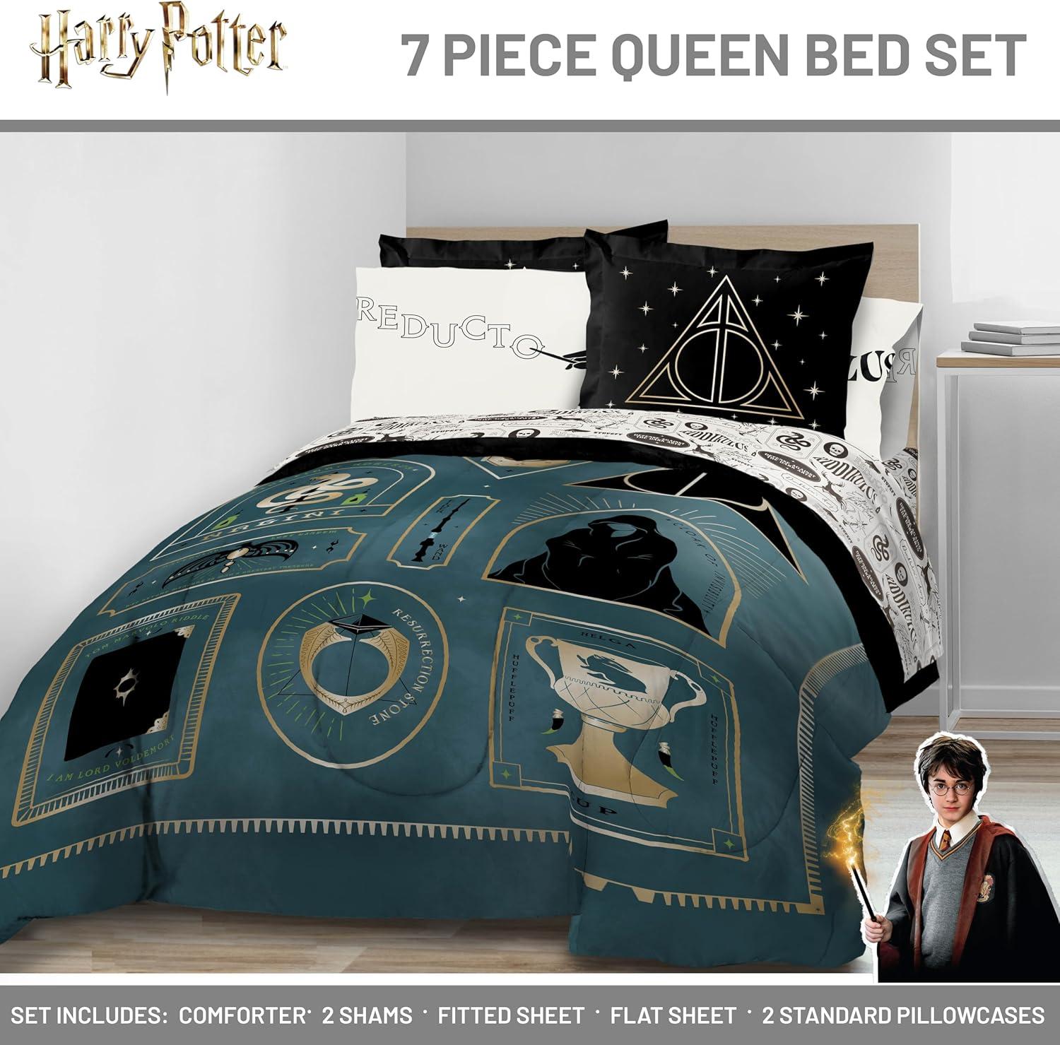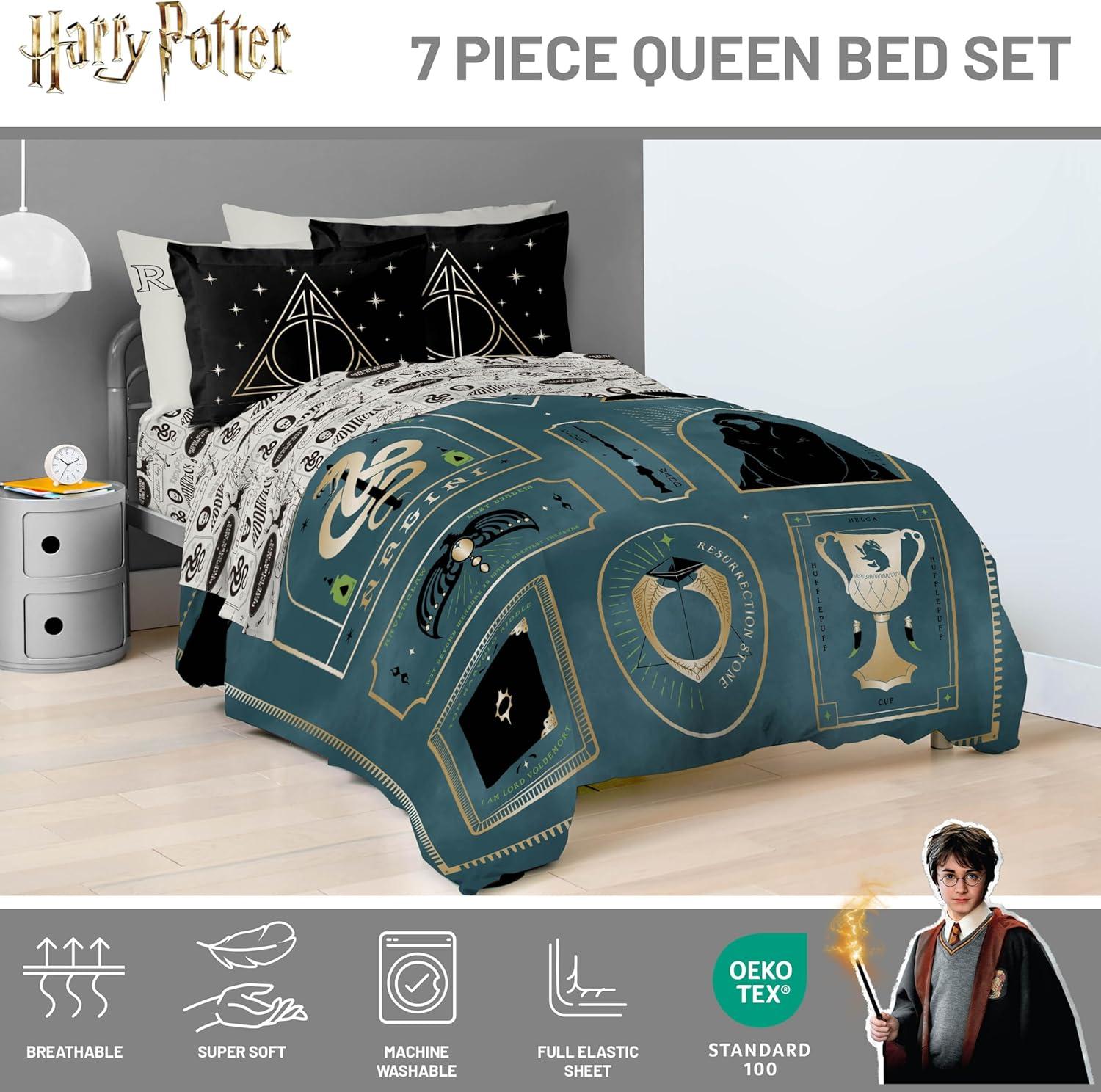 Jay Franco Kids Comforter Set Includes Sheets and Pillow Covers - Soft and Cozy Bed Set for Stylish Room Decor, Black - Marvel Comics, 7 Piece Queen Size Bedding(Blue - Harry Potter)